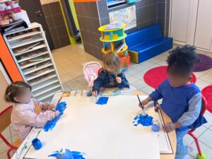 Les élèves de petite section ont créé de magnifiques décorations à suspendre pour embellir le couloir. Nuages, perles de pluie, flocons… tout en camaïeu de bleu, et réalisées avec différentes techniques : peinture, gommettes, tampons…