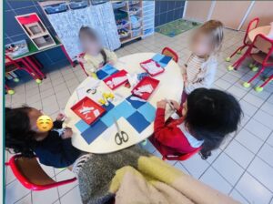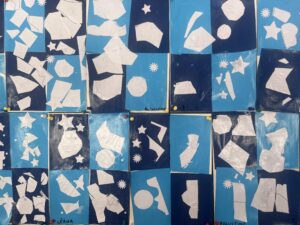Ils ont utilisé, comme l’artiste, différentes nuances de bleu et ont découpé puis collé des formes en papier. Ce travail leur a permis d’apprendre à découper, d’exercer leur imagination et également