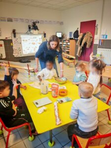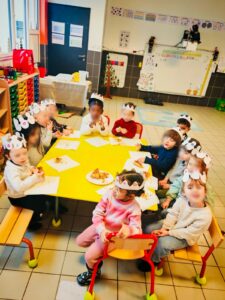 À l’occasion de l’Épiphanie, les élèves de petite section ont préparé des galettes, décoré de jolies couronnes et dansé en ronde sur la chanson « J’aime la galette ».