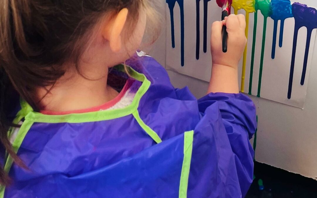 En petite section ,les élèves ont fait couler de la peinture sur des feuilles placées à la verticale Ils ont observé avec émerveillement les coulures descendre de haut en bas, comme la pluie.Cette expérience artistique a permis d’introduire le geste graphique du trait vertical, fondamental pour l’apprentissage des lettres en majuscule d’imprimerie.