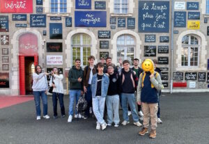 Vendredi 10 octobre, la classe de 1ère générale s’est rendue à Blois pour les Rendez-vous de l’Histoire, accompagnée des professeurs d’Histoire-Géo et de SES, messieurs Rochereau et Desrosiers. Après diverses expositions à la maison de la BD, nous avons assisté une conférence sur les plus grandes firmes françaises et leur situation économique internationale. Puis comme la photo le montre, nous sommes allés à la Fondation du Doute, pour l’exposition d’art contemporain « à bas l’impérialisme ». Enfin, nous avons pu voir deux expositions, une sur l’esclavage et l’autre sur de grandes figures de Français issus de l’immigration, au sein du Centre de la Résistance, de la déportation et de la mémoire.