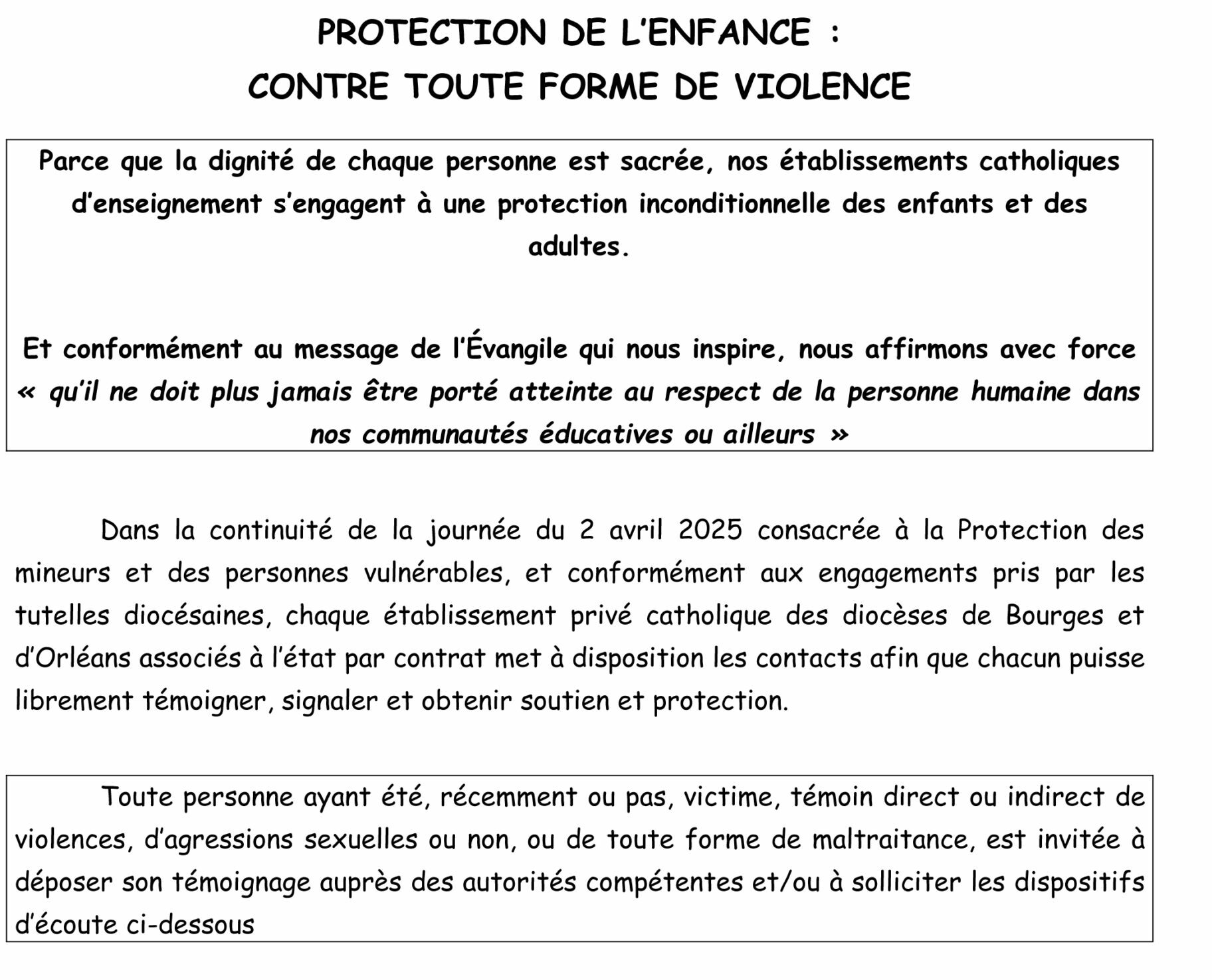 https://www.orleans.catholique.fr/diocese/services-mouvements/protection-education-prevention/signaler/ - Bourges : cellule.ecoute@diocese-bourges.org